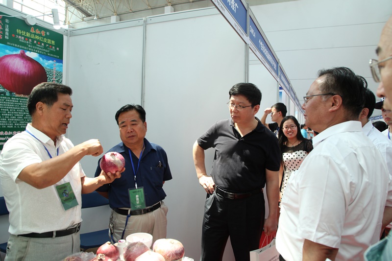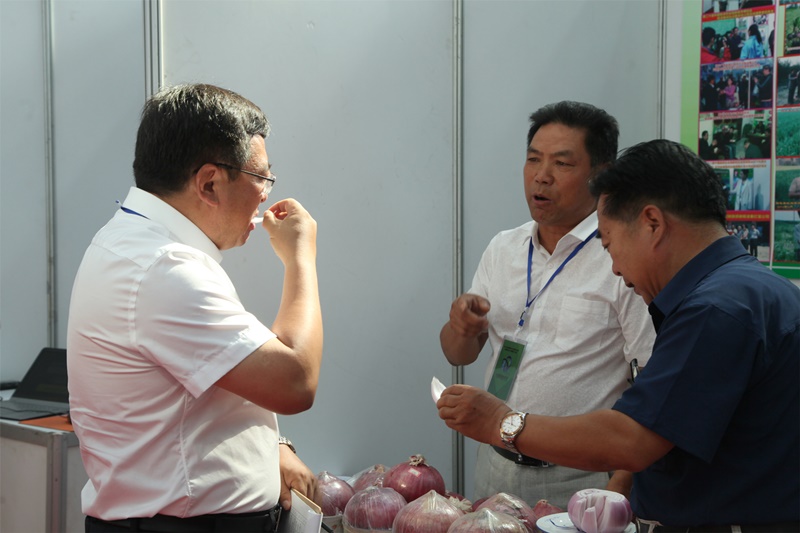 罗总和刘总正在给窦教授讲解秦红宝洋葱优良特点及在全国发展的大好前景。
