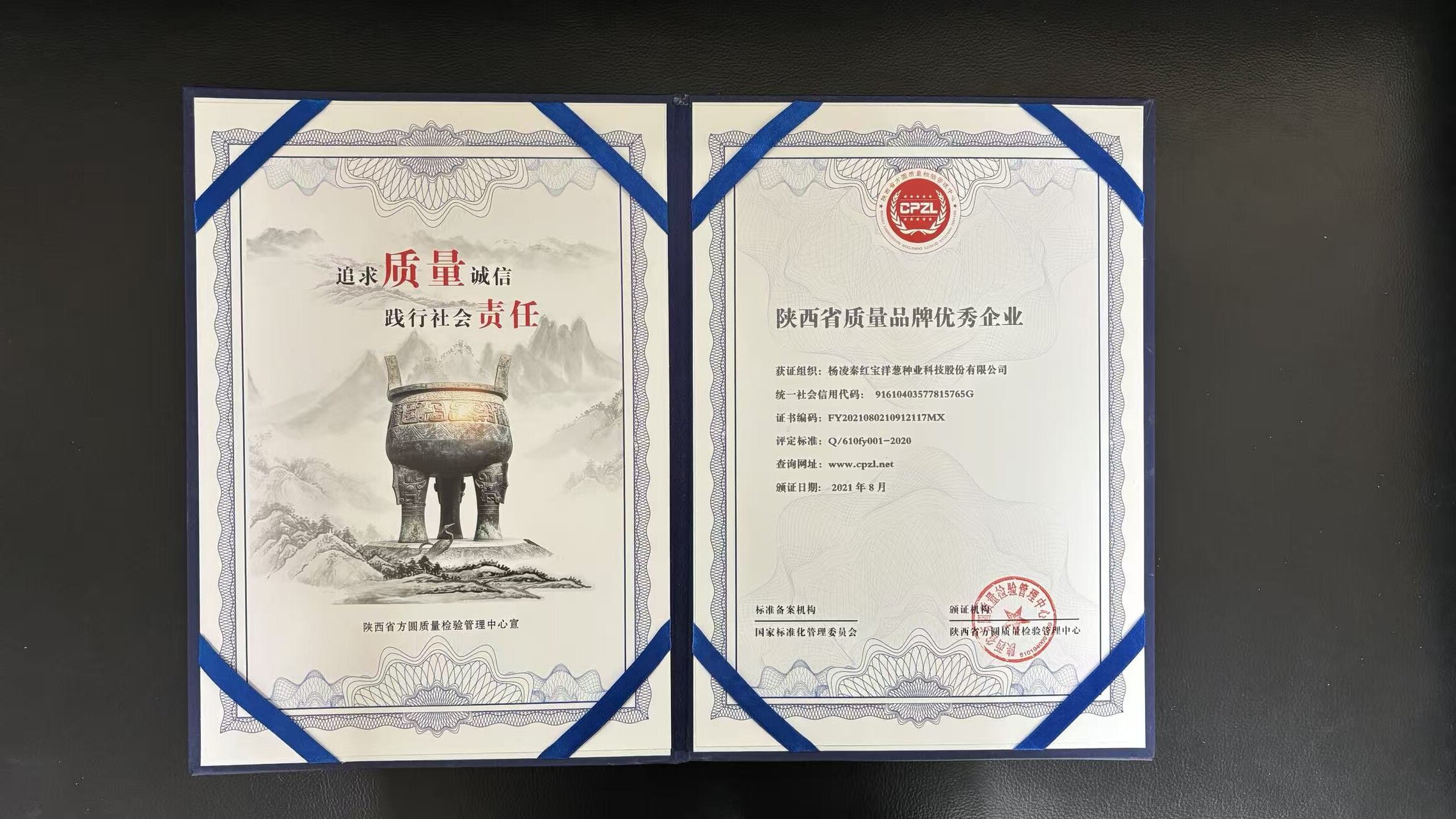 2021年陕西省质量品牌优秀企业证书