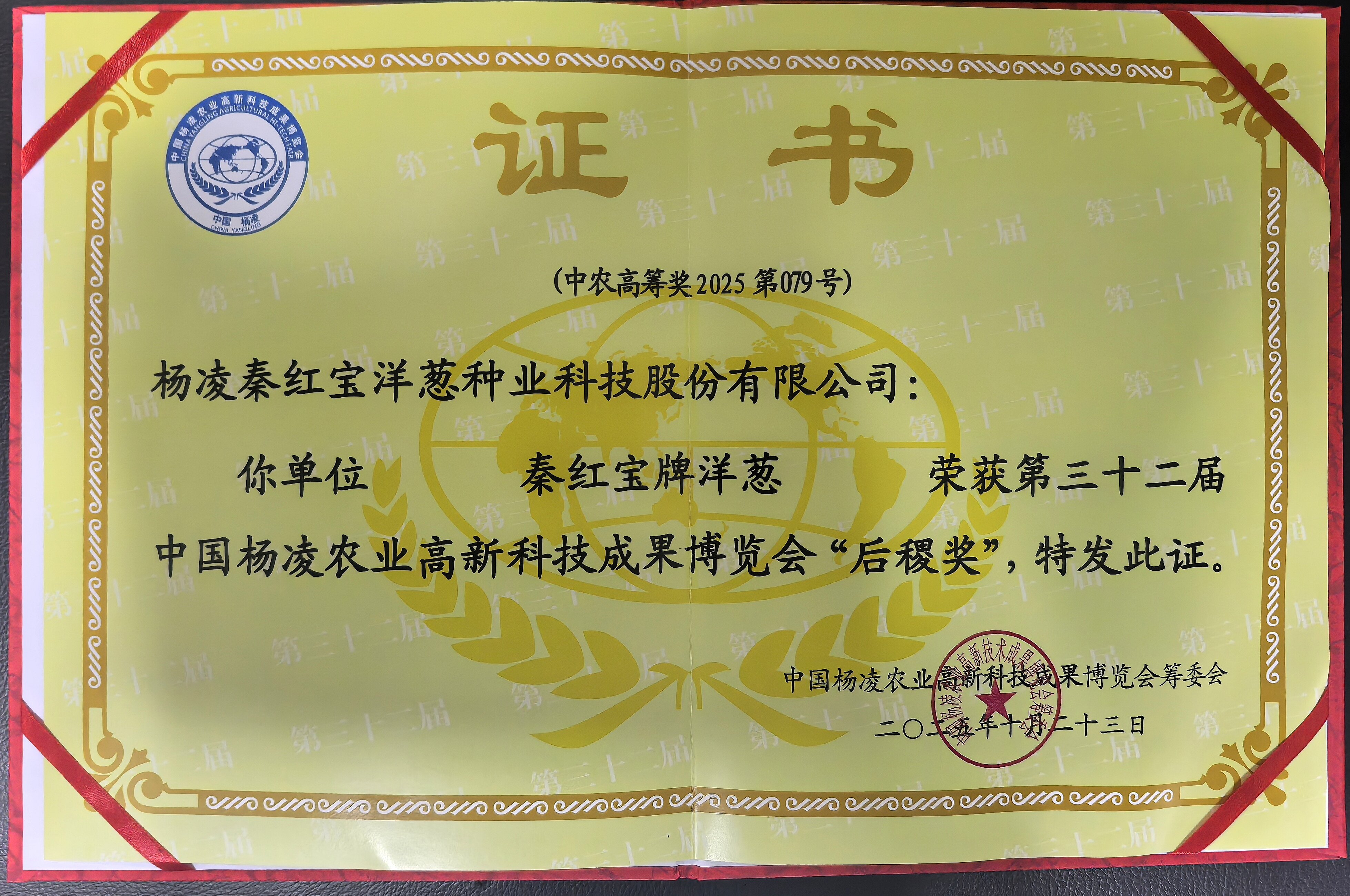 ▲2025年10月秦红宝洋葱新品种荣获“杨凌农高会后稷奖”