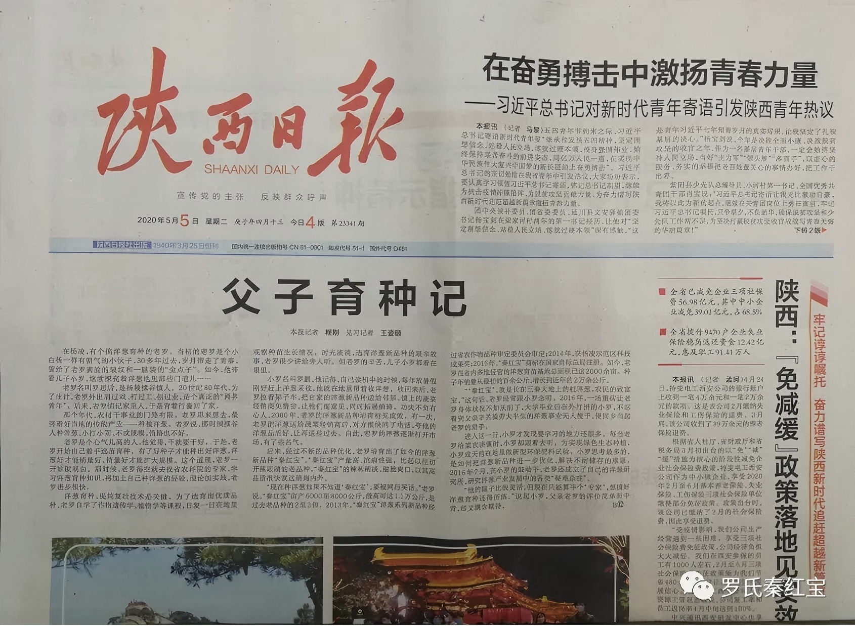 ▲2020年5月5日陕西党报“陕西日报”头版头条刊登《父子育种记》,记录公司创始人罗恩后先生及儿子罗鹏研发培育“秦红宝优质洋葱品种”的艰辛历程。